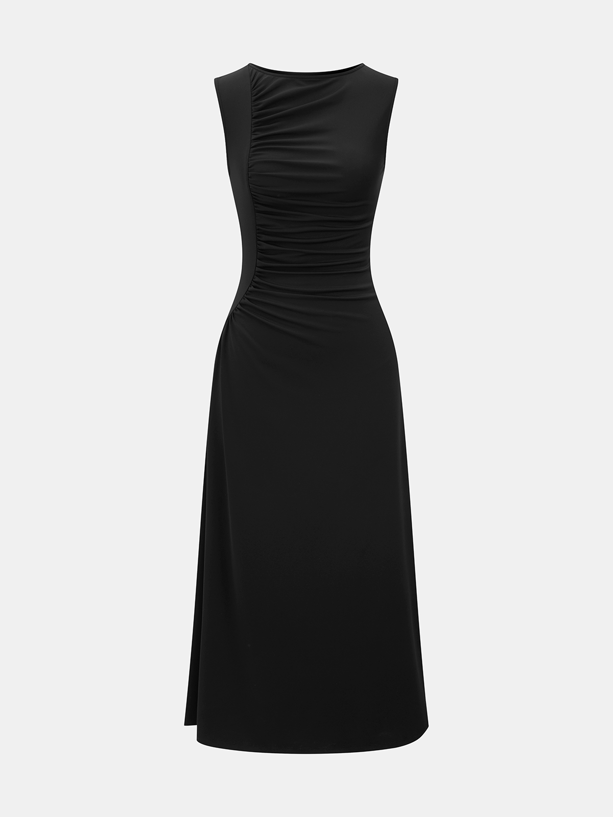 Asymmetric Pockets Cold Shoulder Pleated Long Dress