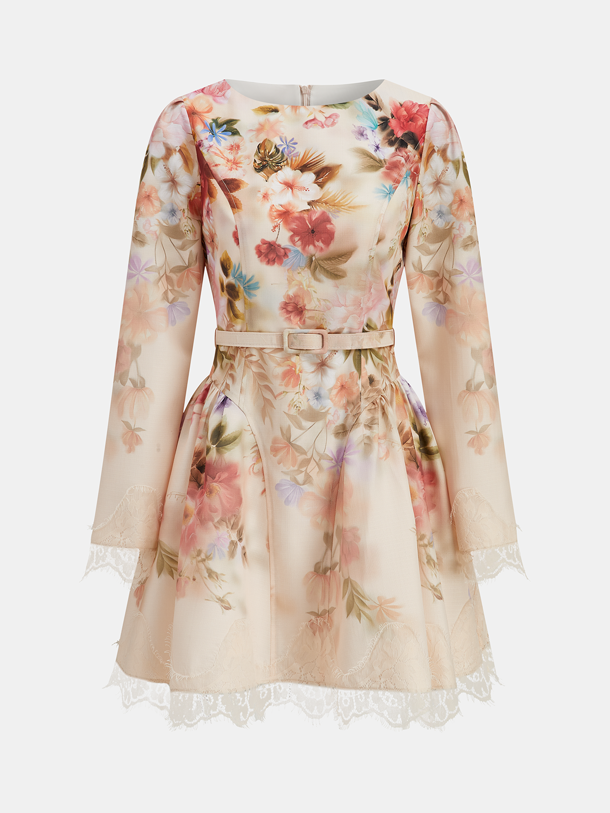 Belted Lace Trim Floral Print Mini Dress