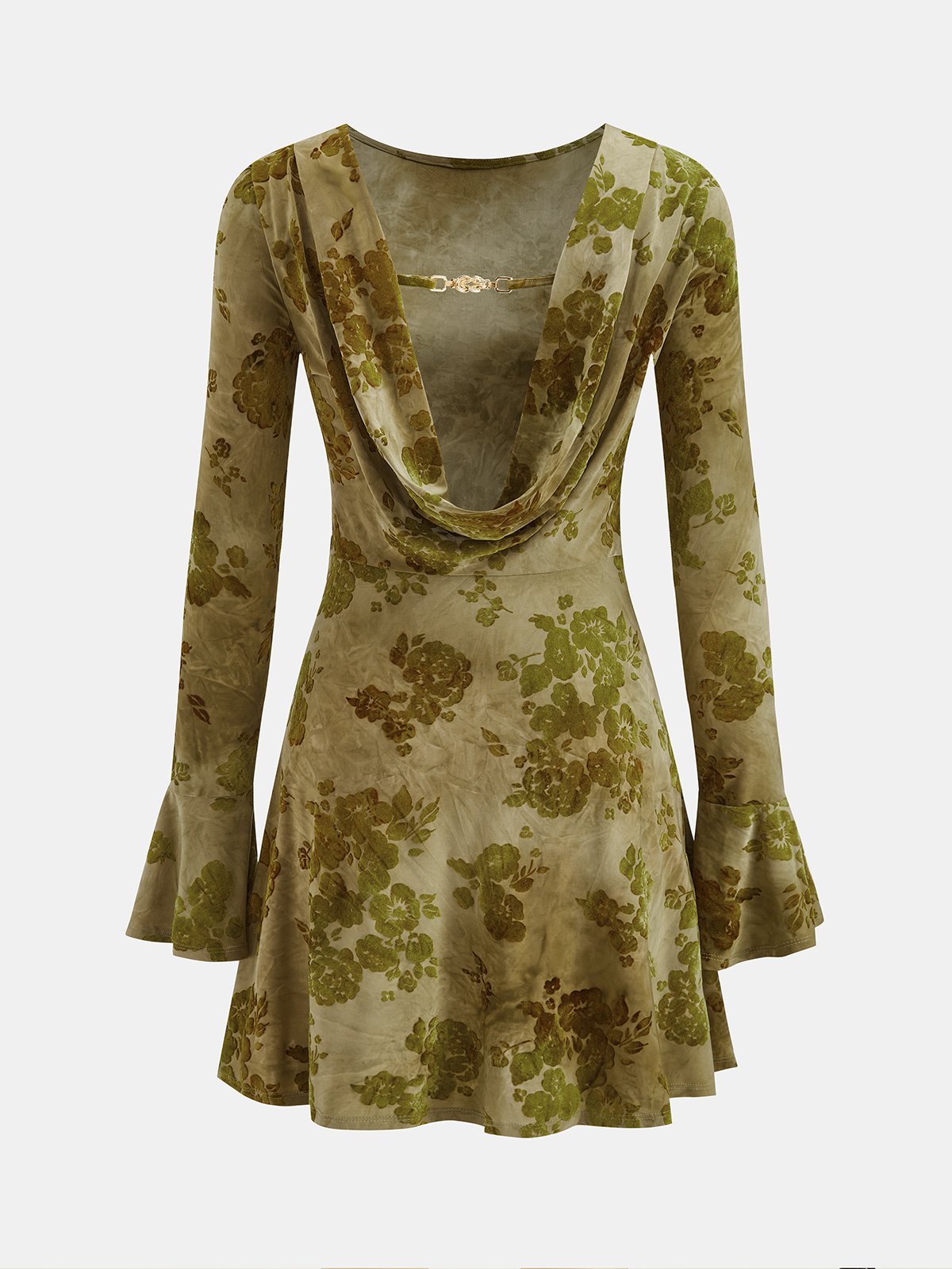 Backless Bell Cuff Floral Print Long-Sleeve Dress