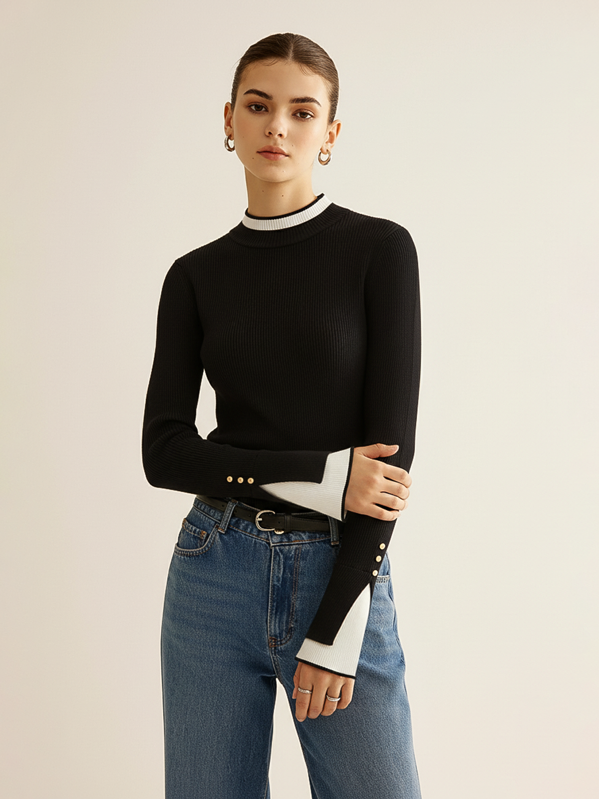 2 in 1 Contrast Cuff Mock Neck Ribbed Knit Top