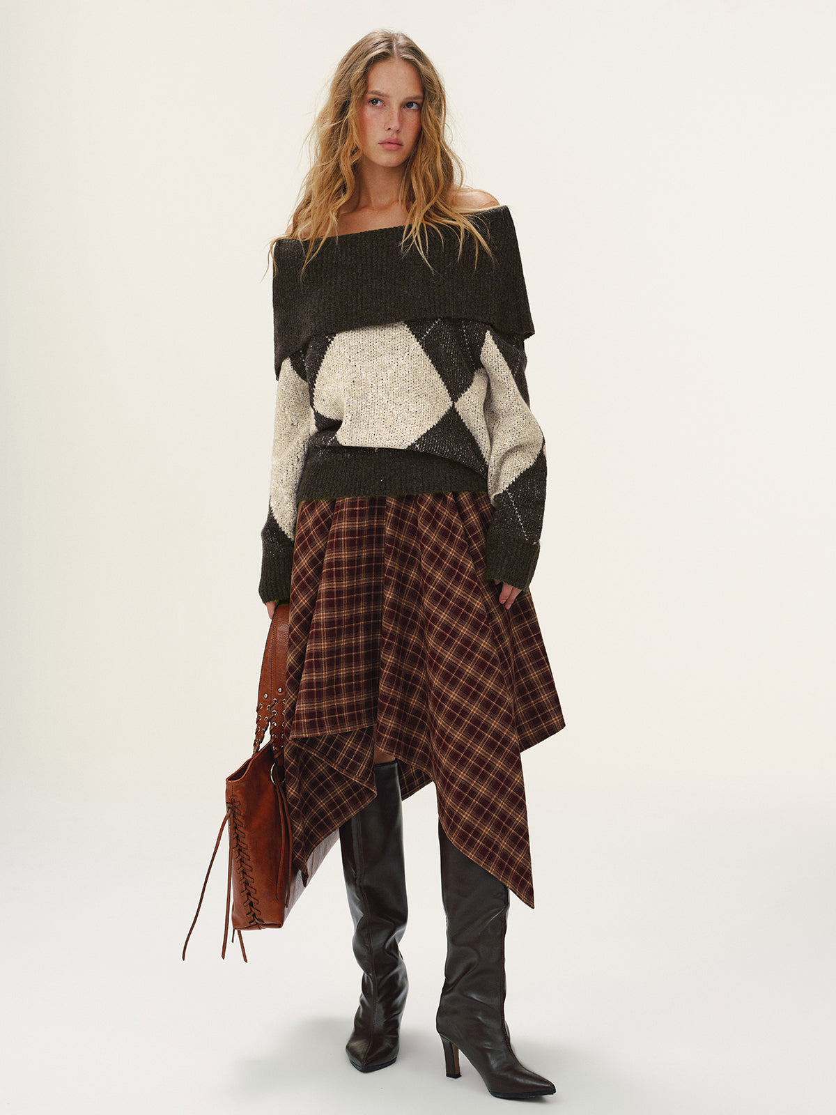 Argyle Pattern Off-Shoulder Sweater