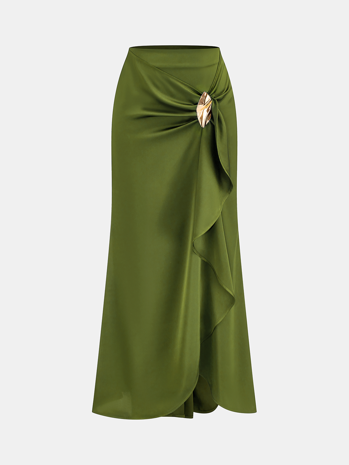 Asymmetric Ruffle Metal Detail Satin Maxi Skirt