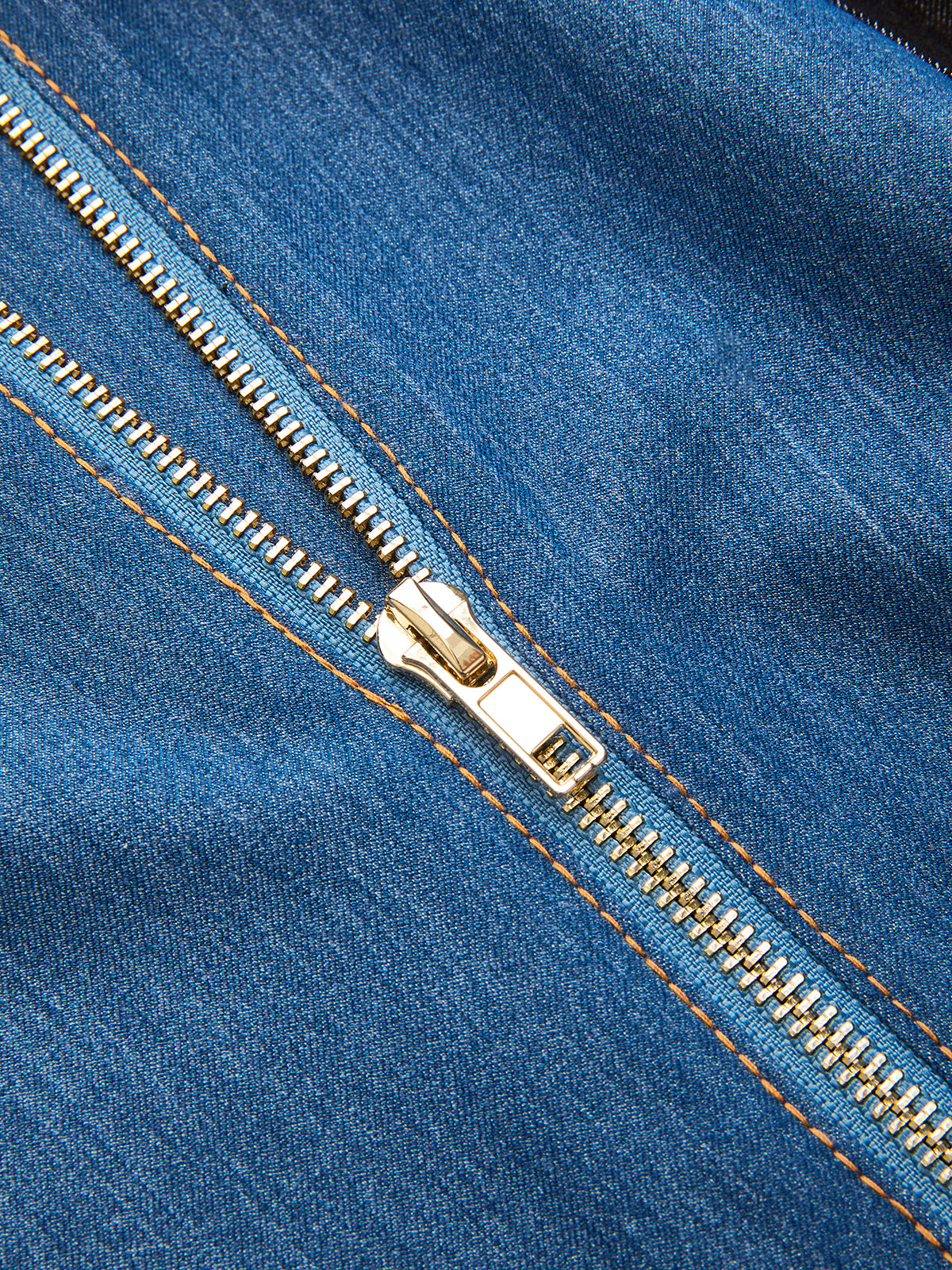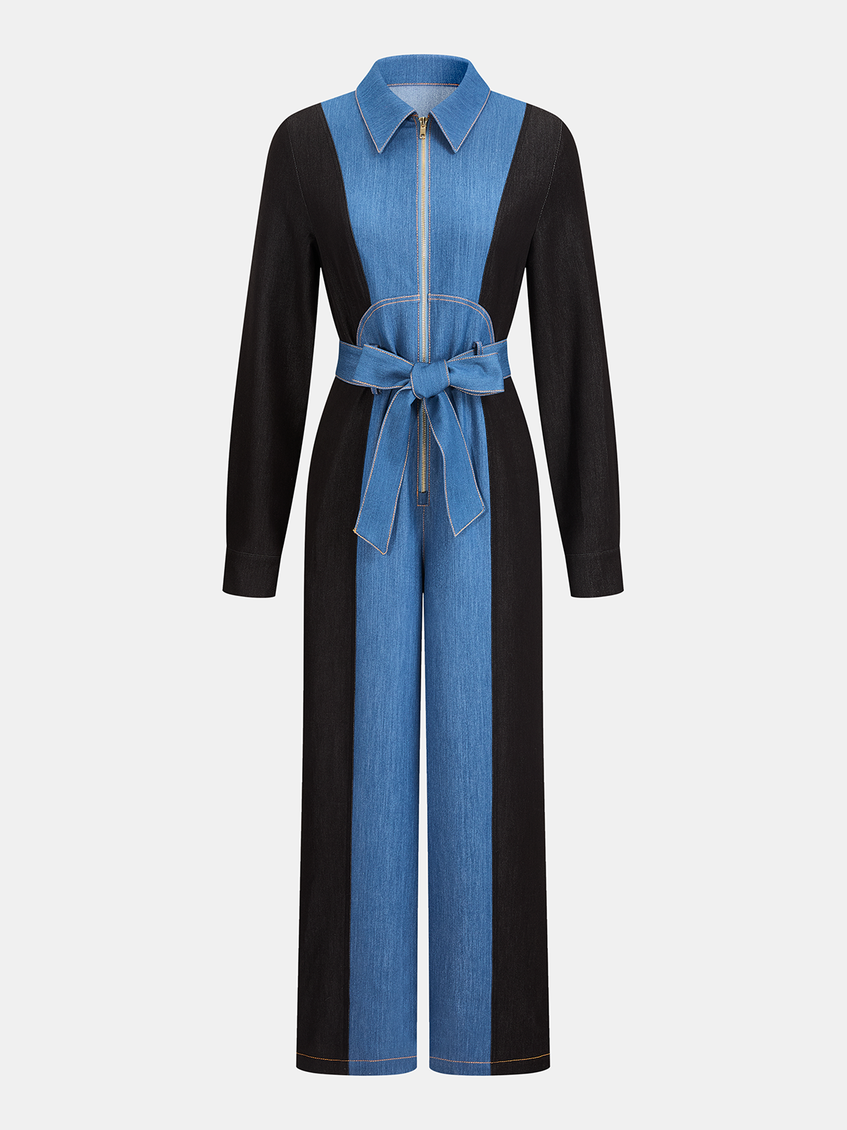 Belted Zipper Front Two-Tone Denim Jumpsuit
