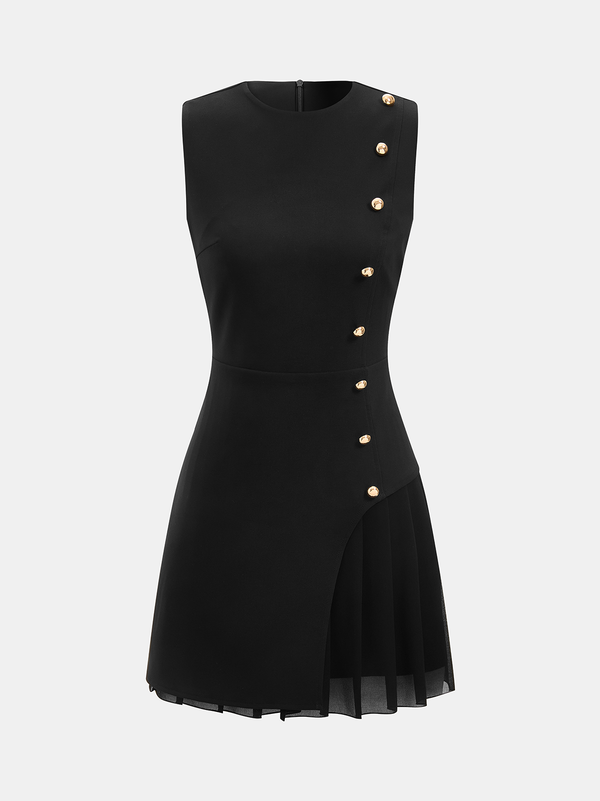 Button Detail Pleated Hem Sleeveless Mini Dress